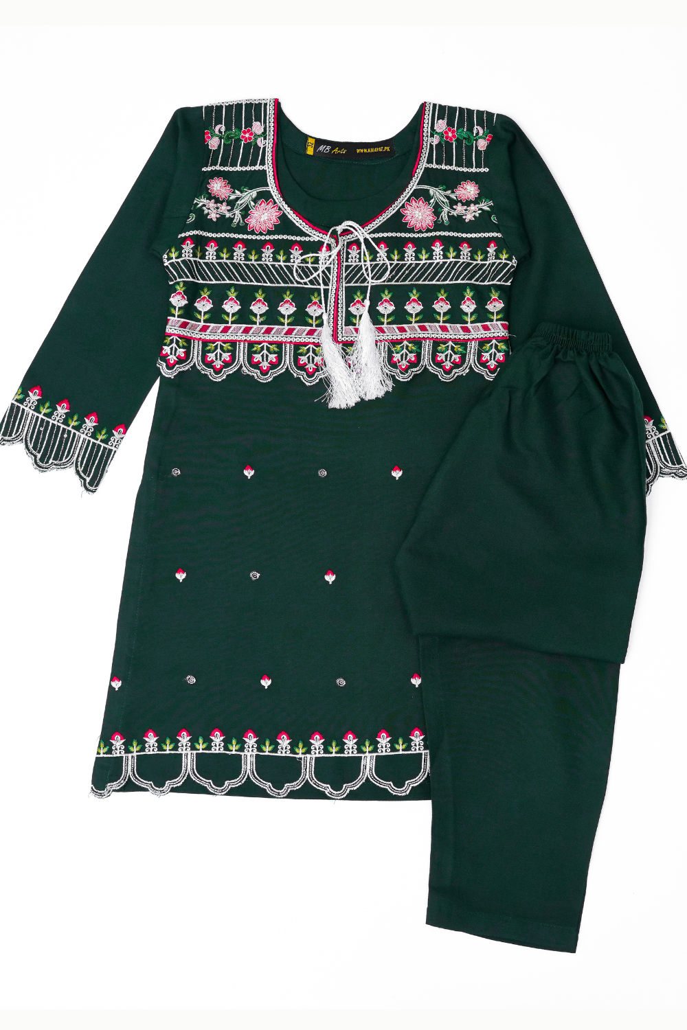 This stylish 2-piece set features an embroidered jacket-style shirt paired with coordinating trousers, showcasing elegant border cut work. The unique jacket design adds a contemporary twist to traditional attire, making it perfect for both casual outings